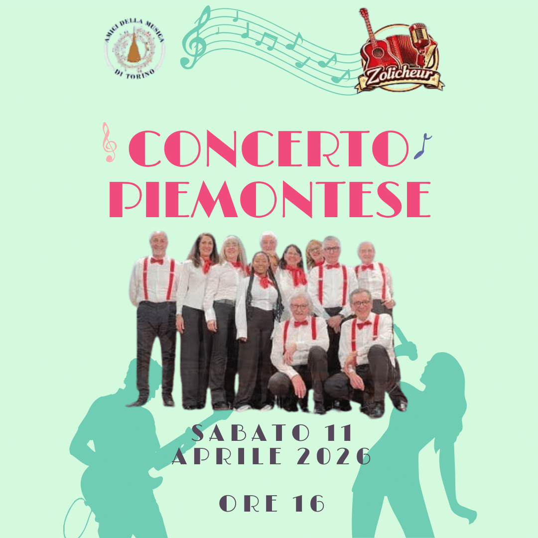 Sabato 11 Aprile 2026 alle ore 16:00 ci sarà il concerto piemontese offerto dal gruppo musicale Amici della Musica di Torino. Un pomeriggio immerso nella melodia piemontese, tra balli e canti popolari.